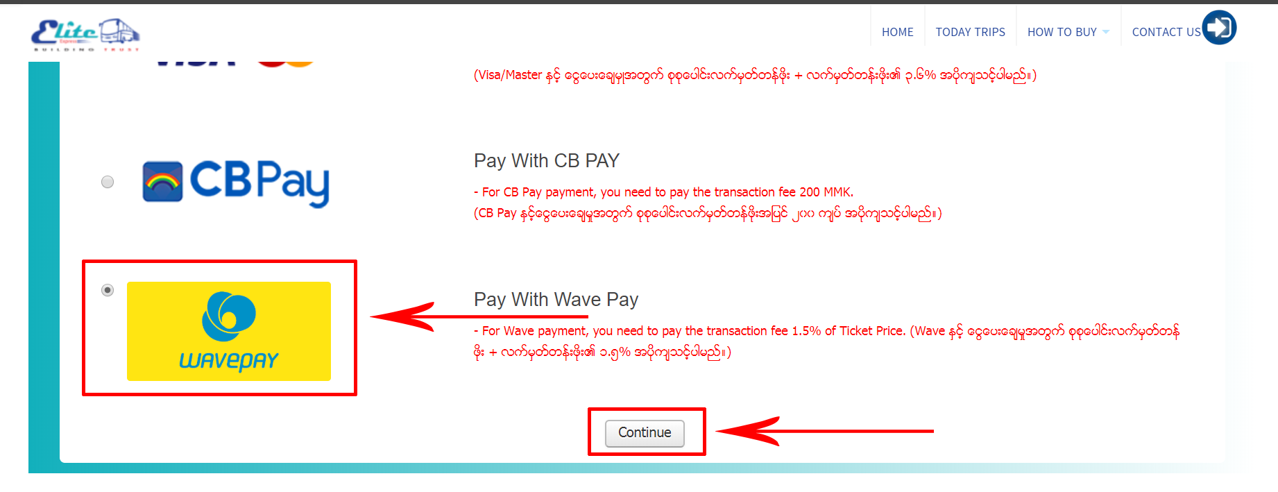 အထက်ပါ အဆင့်များသည် Elite Express Website မှတစ်ဆင့် ဝယ်ယူသူများအတွက်သာ ရည်ရွယ်ပါသည်။ Website အား အသုံးမပြုပဲ Wavepay application မှလည်း Elite ကားလက်မှတ်များအား တိုက်ရိုက် ဝယ်ယူရရှိနိုင်ပါသည်။