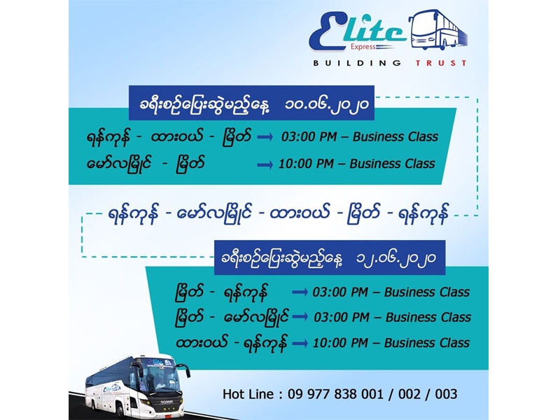 👩ရွှေဝယ်သူ👳 ရွှေဝယ်သားများ👩 မြိတ်သူ👳 မြိတ်သားများ၏ နေ့စဉ်မပြတ် လုပ်ကိုင်ဆောင်ရွက်နေရပါသော စီးပွားရေး လူမှုရေး မိသားစုရေးရာ ကိစ္စရပ်များအား အဆင်ပြေဆောင်ရွက်နိုင်စေဖို့အတွက်🚍 Elite Express မှ လမ်းပန်းဆက်သွယ်ရေးနှင့် ကုန်စည်ပို့ဆောင်ရေး ဝန်ဆောင်မှုများအား ၂၀၂၀ ခုနှစ် ဇွန်လ (၁၀) ရက်နေ့မှစတင်ပြီး ပြန်လည်ဆောင်ရွက်ပေးသွားပါတော့မည် ဖြစ်ပါကြောင်း သတင်းကောင်းပါးအပ်ပါသည်။
